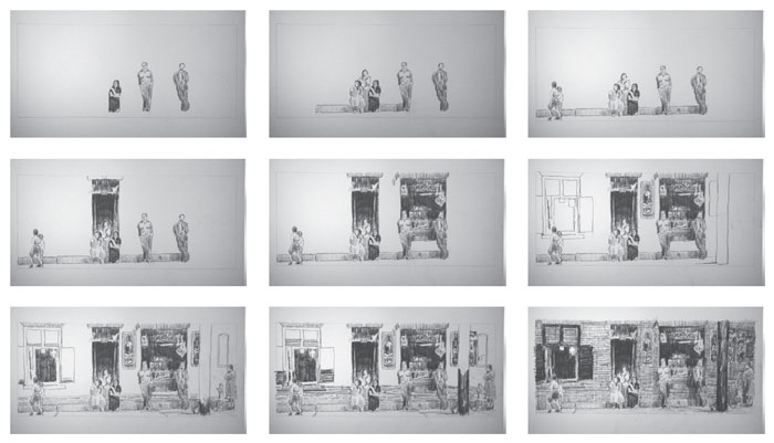 For this project, I have broken with conventional animation and explored new directions, similar to those featured in the work of South AfricanartistWilliam Kentridge. Like Kentridge, I use the same surface for each animation. So rather than a series of drawings to illustrate one of the Griffintown buildings in the film, I simply shot the illustration at many stages in its creation. Rather than using charcoal on paper like Kentridge, however, I have used water-based graphite and colour pencils on Mylar (a material once used by architects) as my primary medium, adding water to bring the drawings to life.